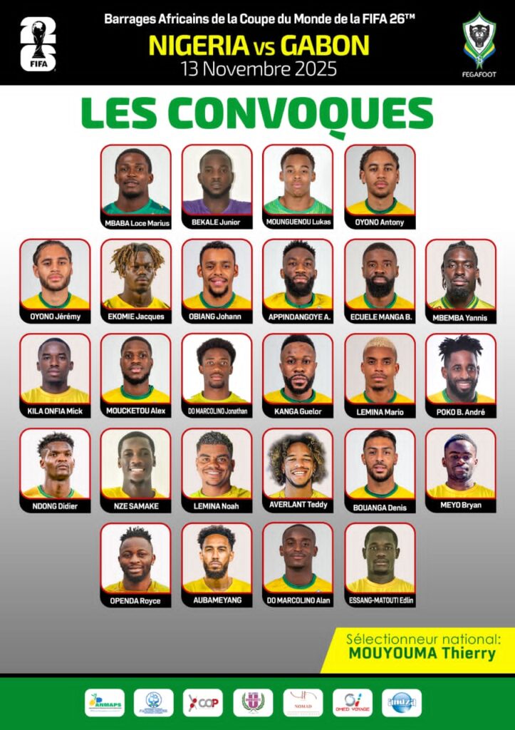 Libreville, (Agence de presse La Plume de l’Info) – Thierry Mouyouma, le sélectionneur national, a révélé ce jeudi la liste des vingt-six joueurs retenus pour représenter les Panthères lors de leur rencontre contre le Nigéria, prévue le 13 novembre 2025 à Rabat (Maroc). Ce match s’inscrit dans le cadre des barrages visant à permettre à l’Afrique d’obtenir une place supplémentaire lors de la prochaine Coupe du Monde de la FIFA 2026, qui se déroulera aux États-Unis, au Canada et au Mexique.